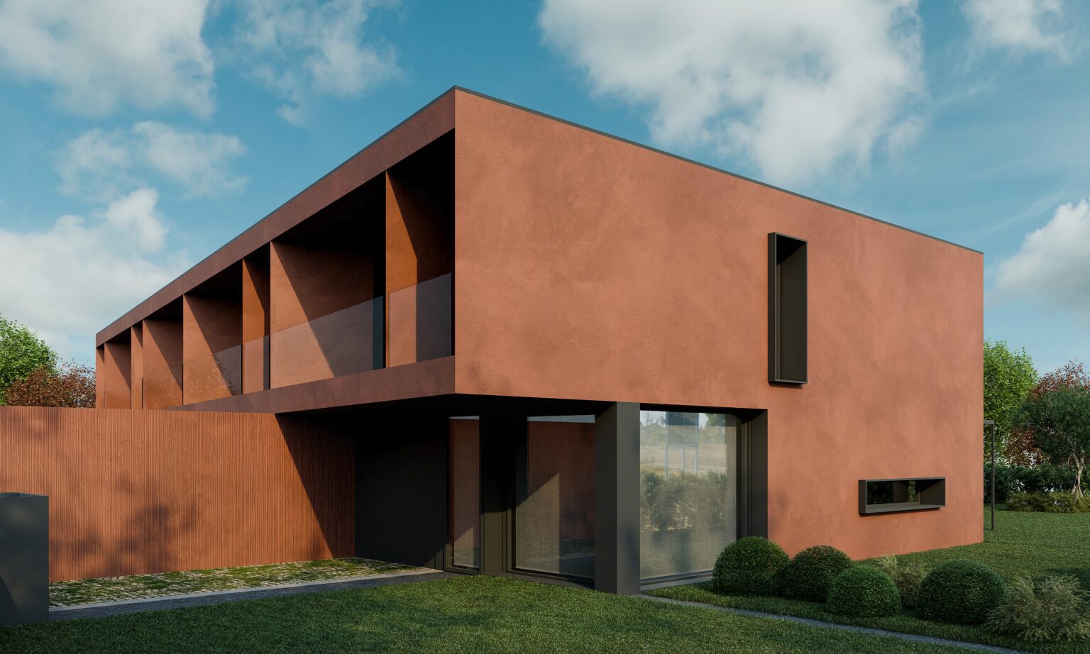 La finitura esterna, di un caldo rosso mattone dalla texture materica, si armonizza con i colori della terra circostante, in sintonia con le prescrizioni del piano colore dei luoghi. Anche la sistemazione esterna, gli accessi e le recinzioni sono pensati come naturale prosecuzione dell’architettura, un continuum capace di dare forma a un abitare intimo e coerente con l’ambiente.